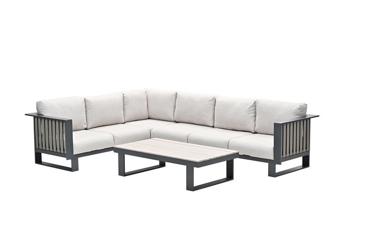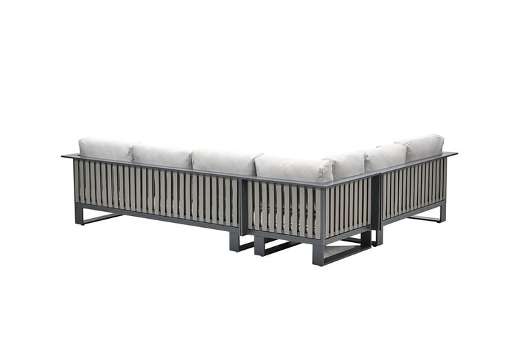 De Bologna vierdelige hoekbank bestaat uit twee bankdelen, een hoek element en een tussen element. Het tussen element kunt u aan beide bankdelen vastmaken en op deze manier maakt u eenvoudig een L-vormige bank.