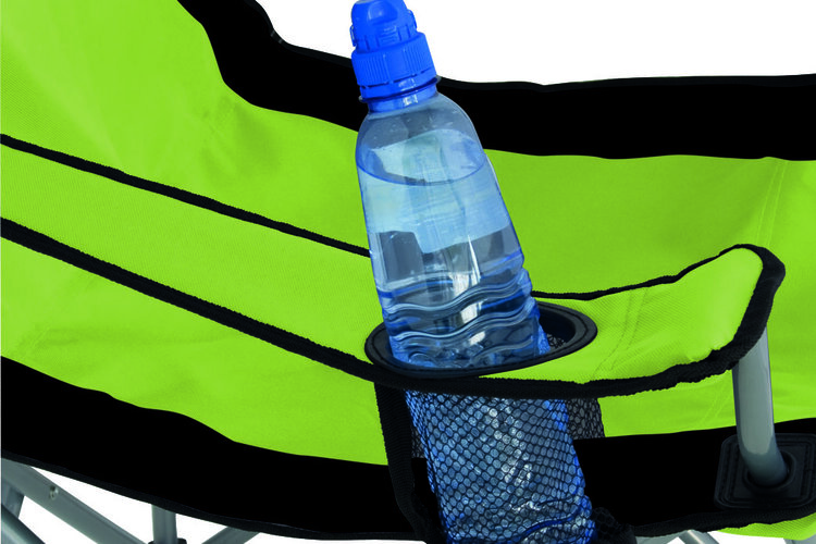 Camping stoel met comfortabele armsteunen voorzien van bekerhouder.