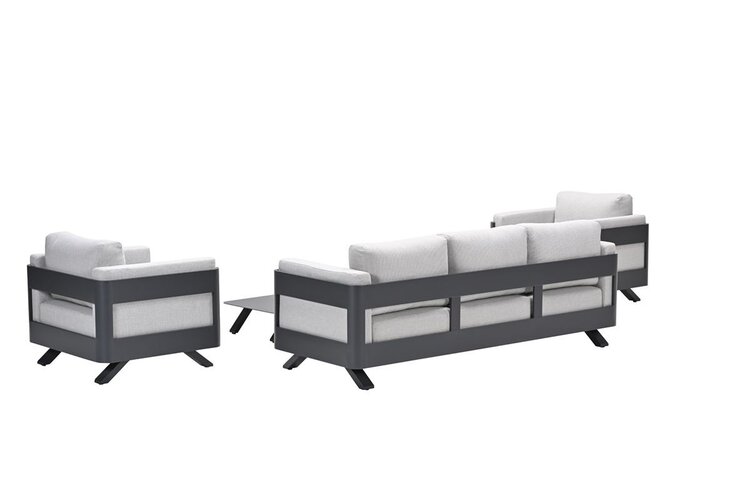 De Realdo loungeset bestaat uit vijf delen: een driezitsbank, twee fauteuils en twee bijpassende loungetafels.
