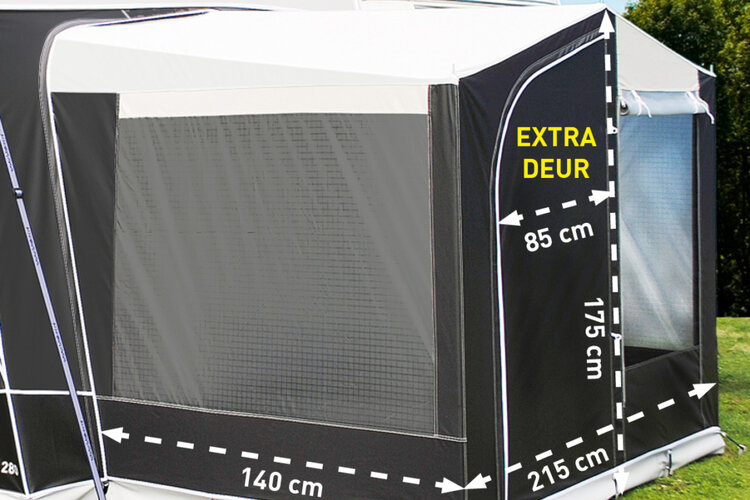 Het is ook mogelijk om een uitbouw De Luxe aan te ritsen. Deze is voorzien van een extra deur aan de buitenkant en een raam met ventilatiegaas. Ideaal voor bijvoorbeeld het stallen van uw elektrische fietsen of als extra slaapcabine (binnentent verkrijgbaar). De uitbouw kan aan beide zijden geplaatst worden en is voorzien van een extra rits zodat de zijwand van de voortent teruggeplaatst kan worden als scheidingswand.